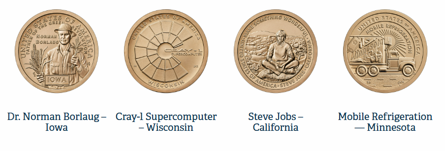 El programa American Innovation $1 Coin Program, establecido por la ley Public Law 115-197, se lanzó en 2018 y cada año destaca la contribución de distintas regiones de Estados Unidos al avance de la ciencia y la tecnología. Cada moneda simboliza una innovación o una figura que transformó el país.