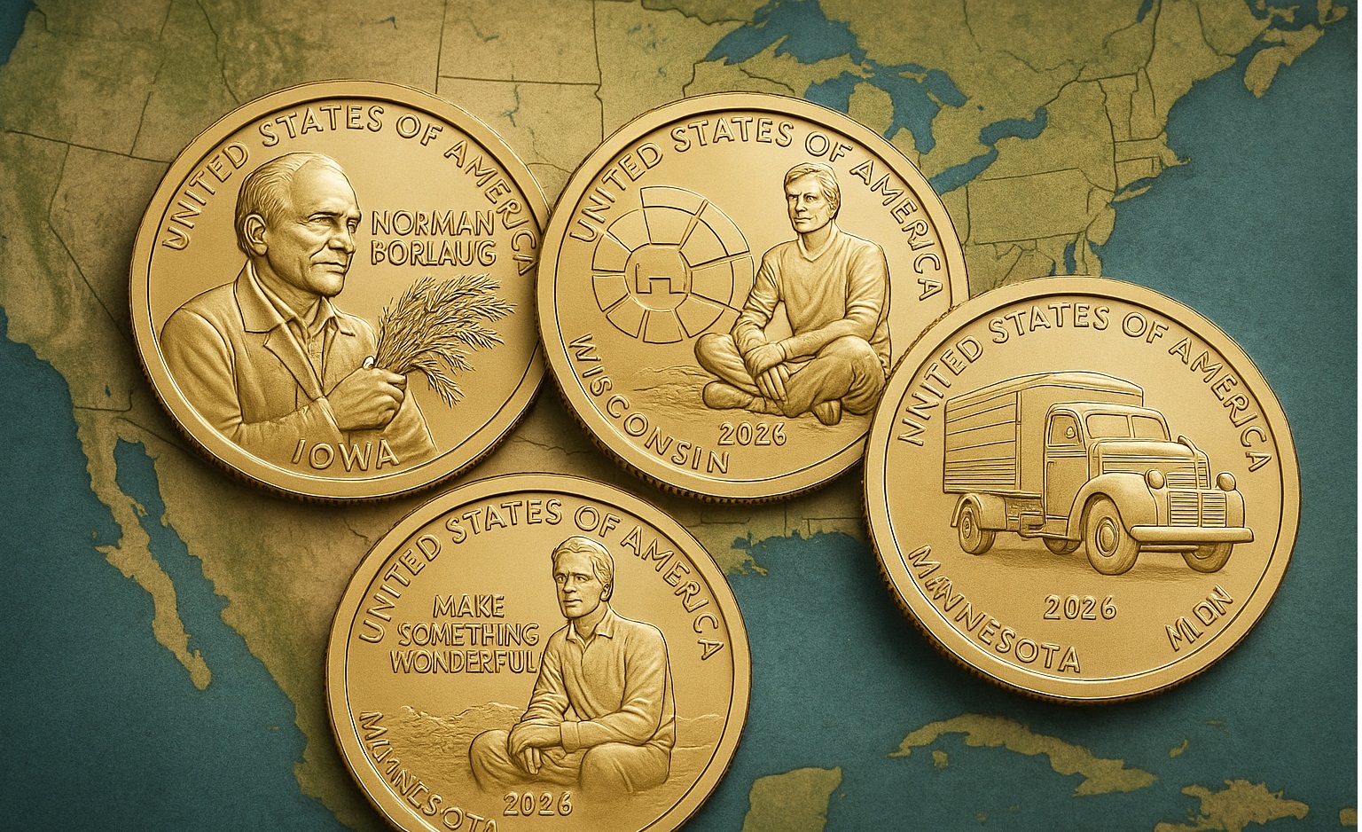 La Casa de la Moneda de Estados Unidos publicó el diseño de la serie de monedas de un dólar American Innovation 2026, dedicada a inventores destacados y logros tecnológicos de cuatro estados: Iowa, Wisconsin, California y Minnesota. El comunicado de prensa se publicó en el sitio oficial de la U.S. Mint (15 de octubre de 2025).