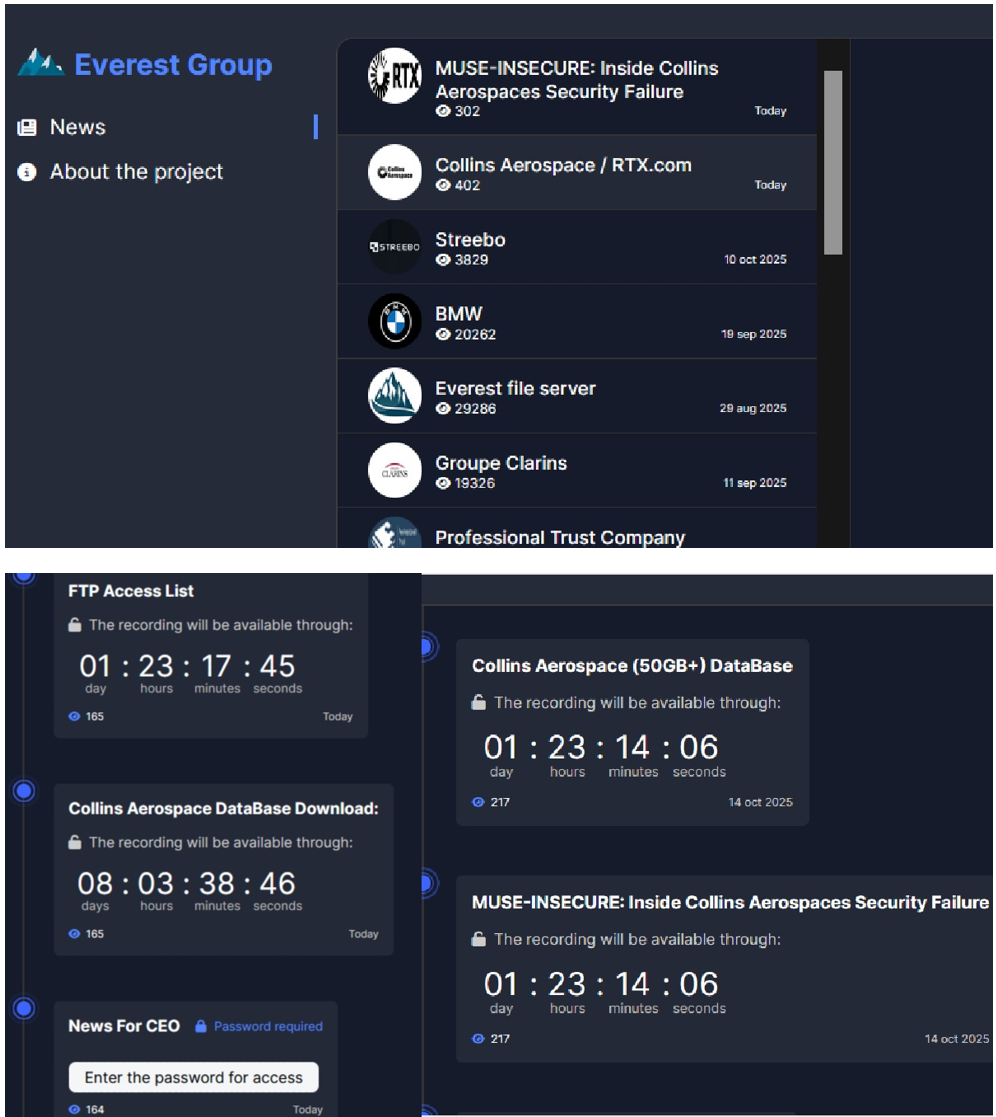 Collins Aerospace, filial de la corporación Raytheon Technologies (RTX), fue añadida a la lista de víctimas en el portal darknet de Everest. La publicación consta de cinco secciones con títulos como «MUSE-INSECURE: Dentro de la falla de seguridad de Collins Aerospace» y «FTP Access List». El último bloque, bajo el título «News for CEO», está dirigido a la dirección de la empresa —probablemente al presidente de Collins Aerospace, Steven Timm, o al director ejecutivo de RTX, Christopher Calio. Según observadores, los atacantes facilitaron la contraseña para acceder a un mensaje privado. Un temporizador de cuenta regresiva iniciado el 14 de octubre mostraba 24 horas hasta la divulgación de datos; sin embargo, el 18 de octubre Everest prorrogó el plazo por 8 días más, lo que podría indicar contacto entre las partes.