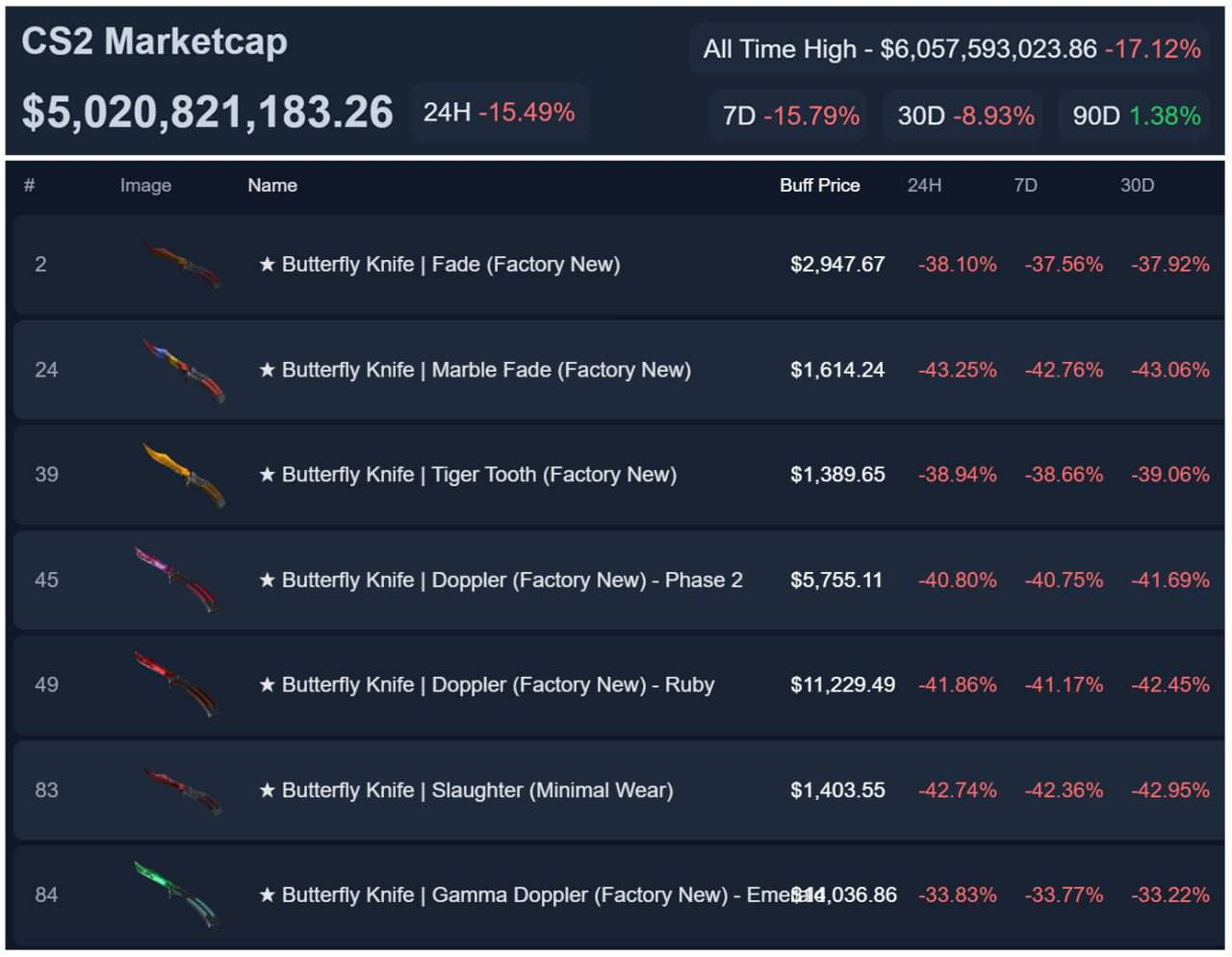 Este cambio convirtió el mercado en caos al instante. Objetos por $5 se podían convertir literalmente con un par de clics en un cuchillo que antes costaba hasta $5000 y venderlo de inmediato. Como resultado, los precios de los cuchillos y guantes raros se desplomaron, mientras que las «armas rojas» — skins de calidad oculta —, por el contrario, se encarecieron entre 10 y 20 veces.