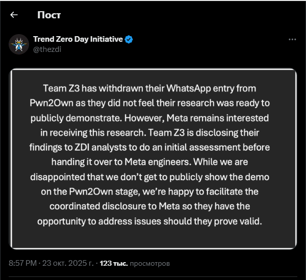 Los investigadores del equipo Z3 renunciaron a demostrar una vulnerabilidad en WhatsApp en el torneo de hackers Pwn2Own Ireland 2025, aunque ese ataque podría haber valido el premio récord de $1 000 000. Según explicó Iniciativa Zero Day, el equipo decidió no mostrar el exploit públicamente, al considerar que la investigación estaba «poco preparada».