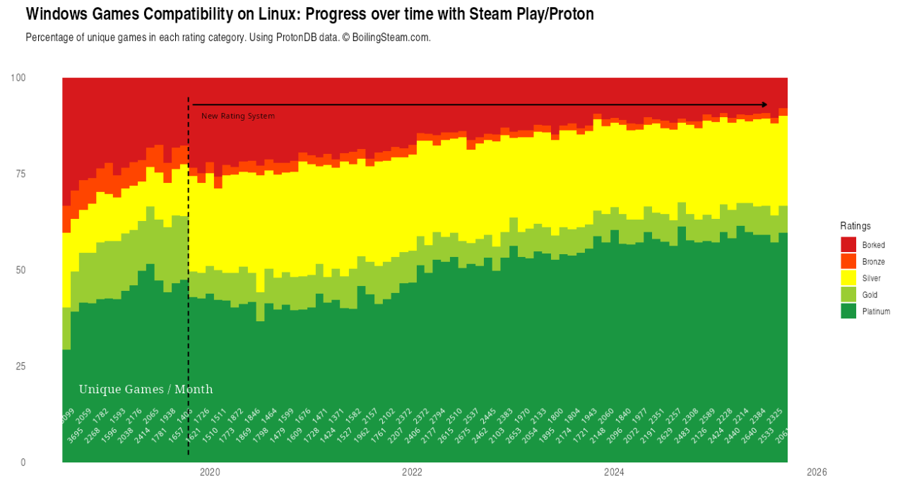 Según Boiling Steam, la cantidad de juegos de Windows que funcionan de forma estable en Linux es la más alta registrada hasta ahora. El análisis se basa en las estadísticas de ProtonDB, que recopila informes de usuarios sobre la ejecución de juegos a través de Proton y WINE.