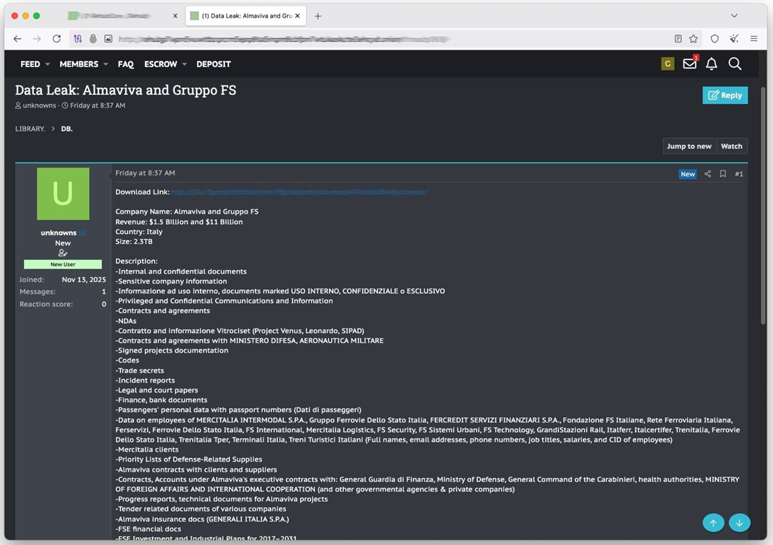 Un ciberincidente en Almaviva, contratista del holding ferroviario italiano FS Italiane, provocó la aparición en la dark web de un gran volumen de archivos internos. El tamaño de la filtración atrajo especial atención, ya que en la red apareció un archivo de varios terabytes con documentos confidenciales.