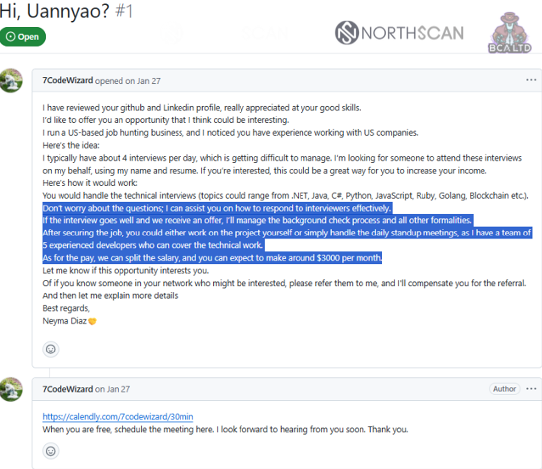 El impulsor de la operación fue el fundador de BCA LTD, Mauro Eldritch, que unió fuerzas con la iniciativa NorthScan y el servicio de análisis interactivo de archivos maliciosos ANY.RUN. Los especialistas de NorthScan crearon un desarrollador estadounidense ficticio, en nombre del cual Heiner García entabló diálogo con un reclutador de Lazarus que usaba el alias Aarón «Blaze». Este se presentaba como intermediario de contratación y trató de presentar al candidato falso como cobertura para trabajadores informáticos norcoreanos, orientándose a empresas de los sectores financiero, de criptomonedas, sanitario e ingenieril.